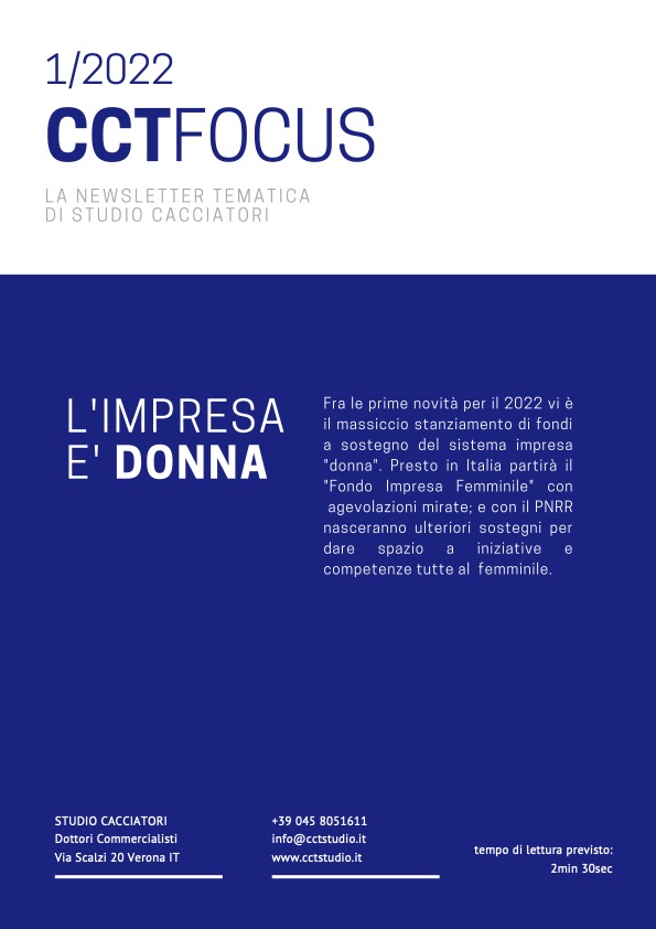 In aggiunta a newsletter e informative di Studio, nasce così CCT FOCUS. Con un taglio volutamente sintetico e giovane, i nostri Professionisti mettono a fuoco tematiche specifiche attraverso fatti chiave, numeri e informazioni utili.